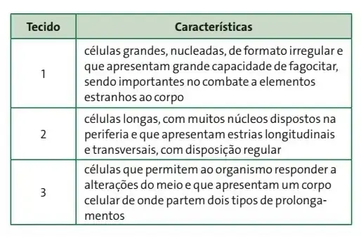 04. (UFPE) No estudo da histologia animal, é muito importante conhecer as características das células. Assinale a alternativa que indica corretamente os tecidos em que as células descritas em 1, 2 e 3 são encontradas, nesta ordem.