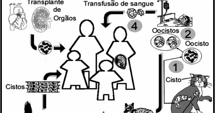 - é causada por um protozoário transmitido através da ingestão de carne mal cozida ou de alimentos contaminados com fezes de gatos.