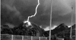 13. (UNIFOR) A figura mostra o momento exato em que um raio cai sobre um monólito, em Quixadá, a 158 Km de Fortaleza. Isso foi registrado em um vídeo na quinta-feira, 23 de março, e tem repercutido em grupos de WhatsApp. A descarga elétrica atingiu a estrutura geológica, que fica localizada ao lado da Galinha Choca, um dos principais pontos turísticos de Quixadá.