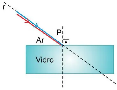 10. (UNESP) A figura representa um feixe formado por dois raios de luz monocromática, um azul e um vermelho, que se propagam juntos pelo ar em uma direção definida pela reta r e incidem, no ponto P, sobre uma lâmina de faces paralelas constituída de vidro homogêneo e transparente.