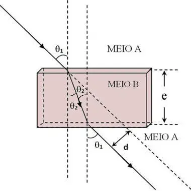 Se o segundo meio citado for um corpo com a forma de paralelepípedo, pode-se ter uma situação como a ilustrada acima, conhecida por Lâmina de Faces Paralelas.