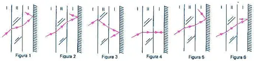 05. (UFMG) Um estreito feixe de luz monocromática passa de um meio I para um meio II, cujos índices de refração absolutos são diferentes. O feixe atravessa o meio II, penetra em um meio idêntico a I e é refletido em um espelho plano. Estas figuras mostram opções de trajetórias para esse feixe de luz.