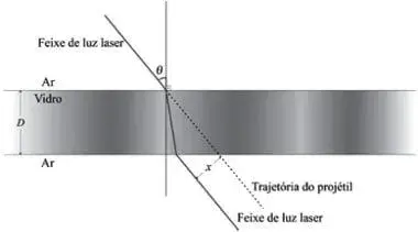 01. (Unirg) Um policial armado com um fuzil de assalto equipado com uma mira laser aponta para um alvo que se encontra atrás de uma janela com um vidro transparente e espesso, como mostrado na figura abaixo. A espessura D do vidro é igual a 2,00 cm, o índice de refração do vidro é igual a 1,5 e o índice de refração do ar é praticamente igual a 1. As trajetórias da bala e do feixe de luz laser incidem na janela de vidro com um ângulo de θ = 60º em relação à reta normal. O vidro da janela tem uma baixa tenacidade e oferece pouca resistência à passagem da bala, de modo que esta segue com sua trajetória retilínea praticamente inalterada. Ao passo que a luz do laser sofre um desvio x levando o policial a mirar em um ponto diferente do que o cano da arma aponta. Com base nessas informações, o desvio x em relação ao ponto alvo e ao ponto atingido será aproximadamente igual a:
