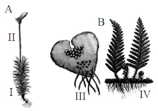 Resolução: A estrutura III corresponde aos soros (2n) que são estruturas de pteridófitas onde os esporângios produzem esporos. Essas estruturas são específicas das pteridófitas.