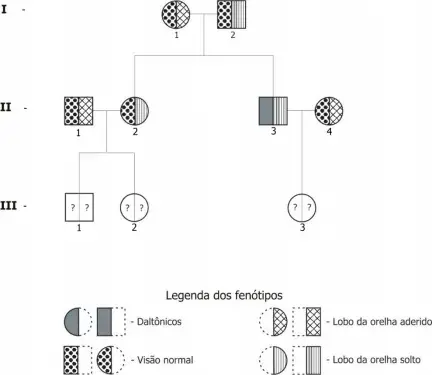Considerando a genealogia apresentada e considerando que o indivíduo II-4 é heterozigoto para daltonismo, a probabilidade de os indivíduos III-1, III-2 e III-3 serem daltônicos e terem lobo da orelha solto, respectivamente, é