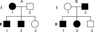 02. (UNESP) Os heredogramas a seguir representam duas famílias, A e B. Na família A, os indivíduos representados por símbolos escuros apresentam daltonismo, uma característica genética de herança recessiva ligada ao sexo. Na família B, os símbolos escuros representam indivíduos portadores de acondroplasia, ou nanismo, uma característica genética de herança autossômica dominante.