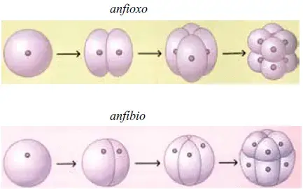 - à ocorrência de divisões mitóticas em maior número na célula-ovo do anfíbio.