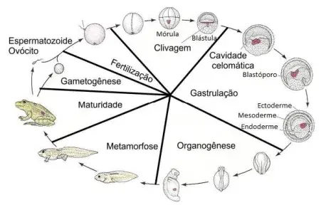 Resolução: Os diferentes estágios de desenvolvimento de um anfíbio se originam a partir de um ovo mesolécito, que contém uma quantidade moderada de vitelo.