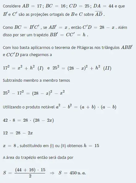 08. (Mack-SP) Em um trapézio, os lados paralelos medem 16 e 44, e os lados não-paralelos, 17 e 25. A área do trapézio é: