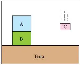 (UNICID) Um sistema contém três blocos, A, B e C: A está apoiado em B e este apoiado na Terra, enquanto C cai livremente sem resistência do ar, como mostra a ilustração.