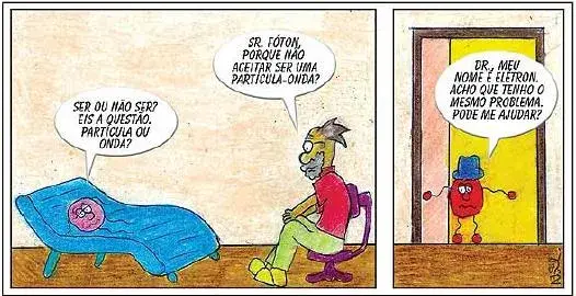 A tirinha faz referência à dualidade onda-partícula, que é um princípio fundamental na física quântica, afirmando que partículas, como fótons, podem exibir comportamento de onda em certos contextos. Para validar essa proposta, o fóton deve ser capaz de demonstrar características ondulatórias e características corpusculares. As opções apresentadas nas alternativas se relacionam com diferentes aspectos do comportamento dos fótons: