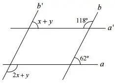 cheguei a essa conclusão pela regra de congruência dos ângulos. Assim, x + y é correspondente ao 62 e o 2x + y é correspondente ao 118. sabendo disso, é só diminuir e teremos que x = 56