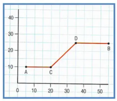 (IFSP) O transporte alternativo é uma maneira de locomover-se usando um meio diferente dos mais tradicionais. A bicicleta é um exemplo disso. Em alguns lugares, ela é usada porque é mais barata, como no interior do Brasil e em países como a Índia e China. Outras pessoas escolhem andar de bicicleta por uma questão ideológica, porque elas não agridem o meio ambiente e não causam tantos transtornos quanto os carros. Usando uma bicicleta, uma pessoa sai do ponto A e dirige-se ao ponto B. O percurso, dado em km, representado pelos segmentos AC, CD e DB está esboçado no gráfico abaixo.