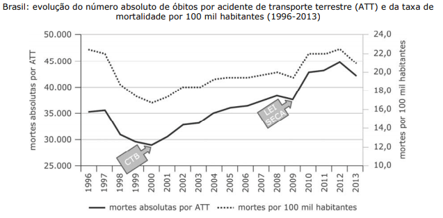 O gráfico anterior mostra a evolução das mortes por acidente de 1996 a 2013, período que inclui a implementação de legislação de trânsito mais rígida, como o novo CTB em 1998 (Lei n.º 9.503/1997) e a nova lei de consumo zero de álcool de 2008, chamada popularmente de Lei Seca (Lei n.º 11.705/2008).