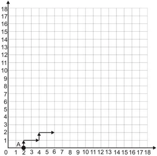 07. (Enem PPL 2009) O gráfico a seguir mostra o início da trajetória de um robô que parte do ponto A (2, 0), movimentando-se para cima ou para a direita, com velocidade de uma unidade de comprimento por segundo no plano cartesiano. O gráfico exemplifica uma trajetória desse robô, durante 6 segundos.
