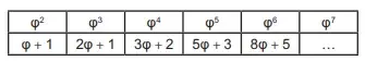 Assim como a potência φ2, as potências superiores de φ podem ser expressas da forma aφ + b, em que a e b são inteiros positivos, como apresentado no quadro.