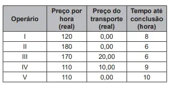 Cinco pessoas responderam informando preços por hora trabalhada, gasto diário com transporte e tempo necessário para conclusão do serviço, conforme valores apresentados no quadro.