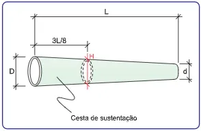 A fabricação da cesta de sustentação é baseada nos valores de D, L e H e considera que a figura corresponde a um tronco de cone reto, cujas circunferências de diâmetros D, H e d são paralelas.