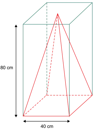 08. (Santa Casa) Um enfeite de Natal, em formato de pirâmide regular de base quadrada de 40 cm de lado, foi acomodado dentro de uma caixa em formato de prisma reto de base quadrada de lado medindo 40 cm e altura 80 cm, como mostra a figura.