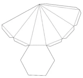 01. (UFPR) A figura ao lado apresenta um molde para construção de uma pirâmide hexagonal regular. Para montar essa pirâmide, basta recortar o molde seguindo as linhas contínuas, dobrar corretamente nas linhas tracejadas e montar a pirâmide usando as abas trapezoidais para fixar sua estrutura com um pouco de cola. Sabendo que cada um dos triângulos tracejados nesse molde é isósceles, com lados medindo 5 cm e 13 cm, qual das alternativas abaixo mais se aproxima do volume dessa pirâmide?