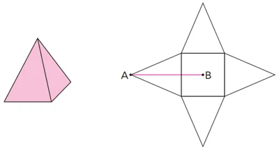 03. (UERJ) Observe a seguir a imagem de uma pirâmide quadrangular regular e a planificação de sua superfície total. Na planificação, o ponto A representa um vértice de uma face lateral e o ponto B o centro da base, sendo AB = 16 cm.
