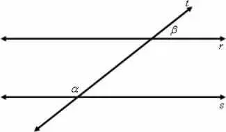 4. (Uniube–MG) Na figura abaixo, as retas r e s são paralelas, cortadas por uma transversal t. Se a medida do ângulo α é o triplo da medida do ângulo β, então a diferença α – β vale: