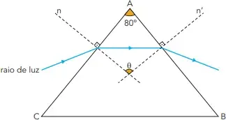Na imagem a seguir, o triângulo ABC representa uma seção plana paralela à base de um prisma reto. As retas n e n’ são perpendiculares aos lados AC e AB , respectivamente, e BÂC = 80°.