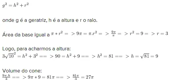 03. (UNIFOR-CE) Em um cone reto, a área da base é 9π cm² e a geratriz mede 3√10 cm. O volume desse cone, em centímetros cúbicos, é: