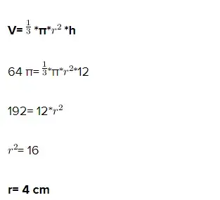 Resolução: Temos um cone reto que possui altura h=12 cm e volume de 64π e temos que achar o valor da geratriz que é qualquer segmento que tenha uma extremidade no vértice do cone e a outra na curva que envolve a base.