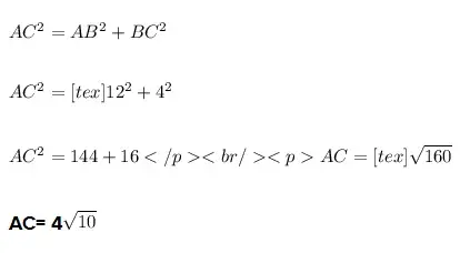 Como o raio é igual ao segmento BC, e AB corresponde à altura também conhecida, calculamos então AC que é a geratriz do cone (hipotenusa do triângulo):