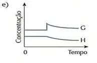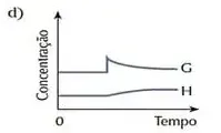 07. (Cesgranrio) O sistema representado pela equação F + G ⇄ H estava em equilíbrio. O estado de equilíbrio foi alterado bruscamente por uma adição da substância G. O sistema reage no sentido de restabelecer o equilíbrio. Qual dos gráficos a seguir melhor representa as modificações ocorridas ao longo do processo descrito?