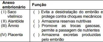 15. (UFAM PSC) Anexos embrionários originam-se dos folhetos germinativos, constituindo-se em estruturas que auxiliam na proteção e nutrição do embrião durante seu desenvolvimento. Correlacione o anexo embrionário à sua respectiva função.