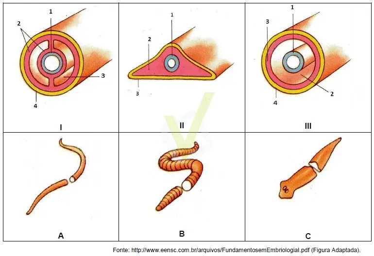 03. (UPE) Observe a figura com os cortes transversais do corpo de animais triblásticos (representados por números romanos; os números em arábico correspondem aos folhetos embrionários e às cavidades) e alguns exemplares (representados por letras).