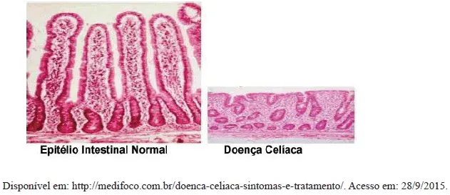 02. (UEMG) Crianças e adultos, geneticamente predispostos, ao ingerirem glúten (mistura de proteínas que se encontram naturalmente no endosperma de sementes de gramíneas) iniciam a produção de anticorpos que atacam o próprio epitélio intestinal. Esse ataque resulta na perda das microvilosidades intestinais que desencadeia um conjunto de sinais e sintomas conhecidos como Doença Celíaca.