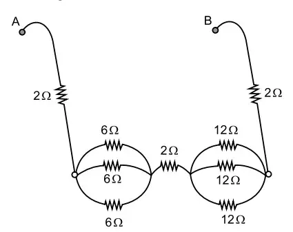 03. (UEFS) Para decorar a fachada de sua ótica, o proprietário construiu uma peça com elementos resistivos que, quando percorridos por corrente elétrica, emitem luz. A peça de decoração pronta corresponde à associação de resistores entre os pontos A e B, indicada na figura.
