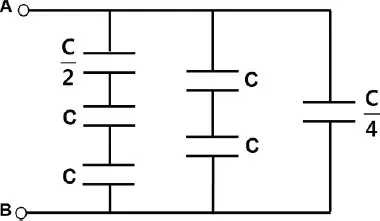 Na associação de capacitores, esquematizada acima, a capacitância está indicada na figura para cada um dos capacitores. Assim, a capacitância equivalente, entre os pontos A e B no circuito, é