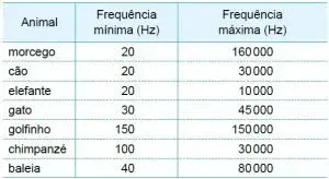 02. (UEFS) Ondas sonoras são ondas mecânicas, produzidas pela deformação do meio por onde se propagam. Dependendo da frequência da fonte emissora dessas ondas, elas podem ou não ser detectadas pela orelha humana e pelas orelhas de outros animais. A tabela apresenta as faixas de frequências detectadas por alguns animais.