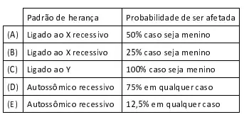 A relação correta entre o padrão de herança desta forma de adrenoleucodistrofia e a probabilidade de que a criança seja afetada é: