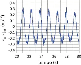 O gráfico foi gerado a partir de dados extraídos por um aplicativo do acelerômetro de um smartphone pendurado por um fio e colocado para oscilar sob a ação da gravidade. O gráfico mostra os dados de uma das componentes da aceleração (corrigidos por um valor de referência constante) em função do tempo.