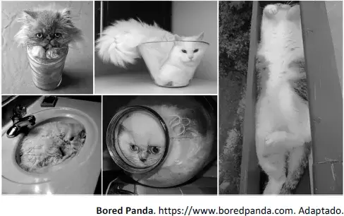 08. (Fuvest 2019) Uma postagem de humor na internet trazia como título “Provas de que gatos são líquidos” e usava, como essas provas, fotos reais de gatos, como as reproduzidas aqui.