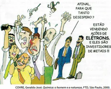 06. (UEMA) A charge a seguir difunde a ideia de que os elétrons estão em alta na fictícia bolsa “química” de valores.